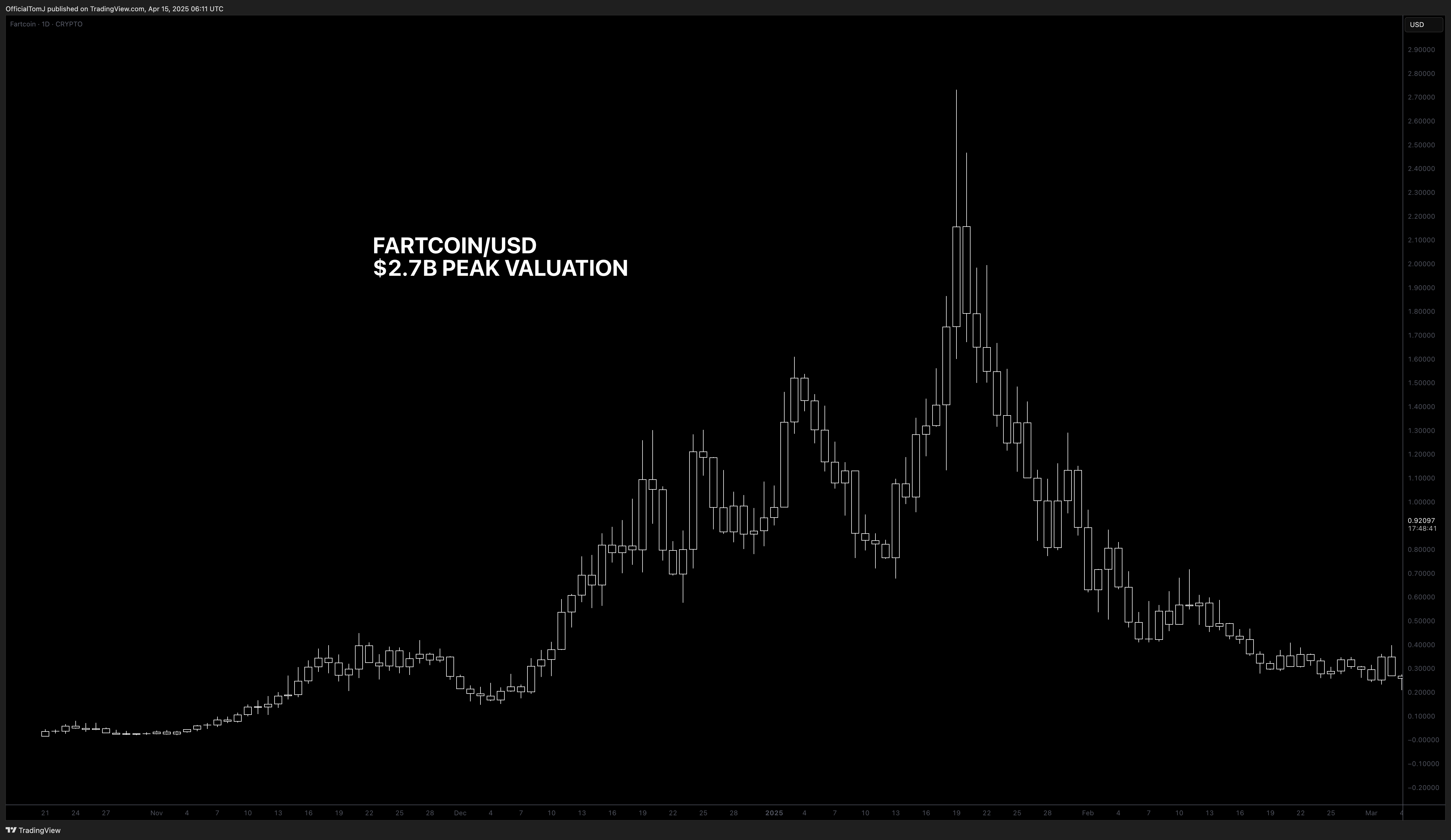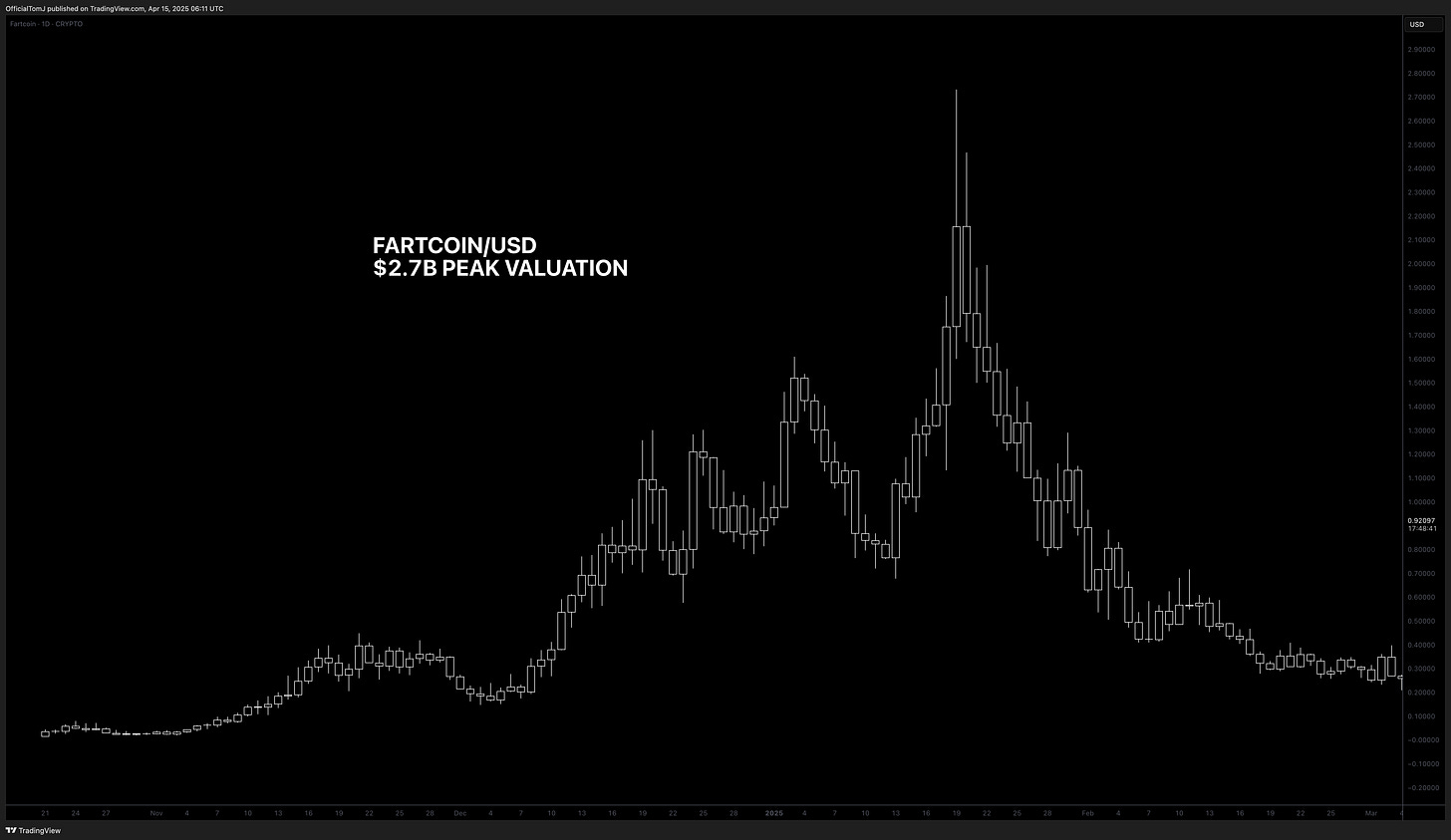 While Bitcoin and large-cap altcoins were experiencing healthy growth, an even greater mania was unfolding in the memecoin sector. The speculative demand for meme tokens reached unprecedented levels, with Dogecoin soaring from $0.15 to $0.50, igniting widespread retail FOMO. Platforms such as Pump.fun facilitated an explosion of new token launches, leading to the rise of highly speculative assets like FARTCOIN, which skyrocketed to a $2.7 billion market cap within 90 days.