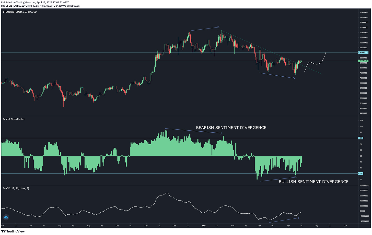 - Sentiment Divergence: The Fear and Greed Index hit a low of 10 during the dip, and formed a higher low at 18, even as price printed a slightly lower low — classic sentiment divergence.