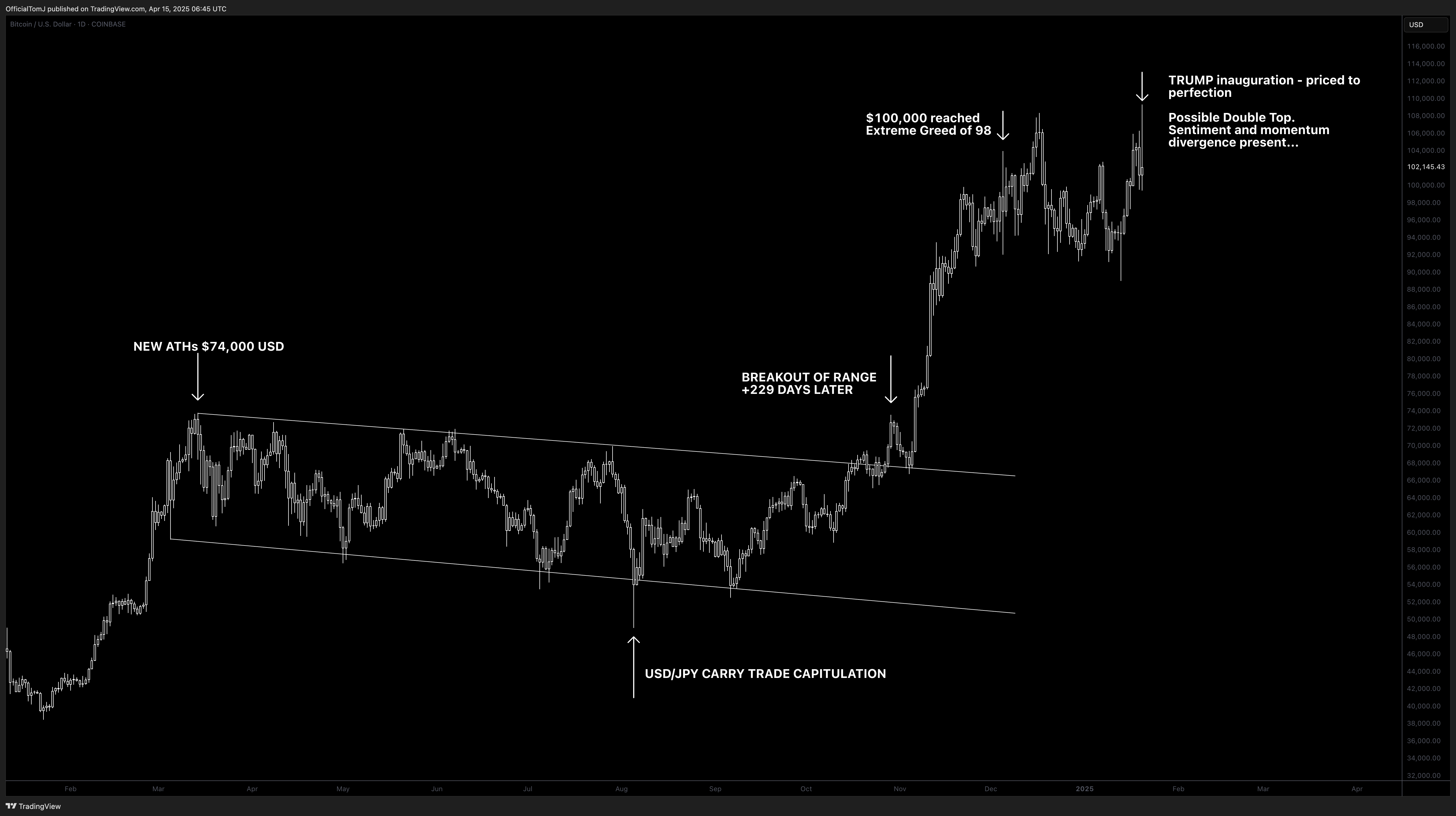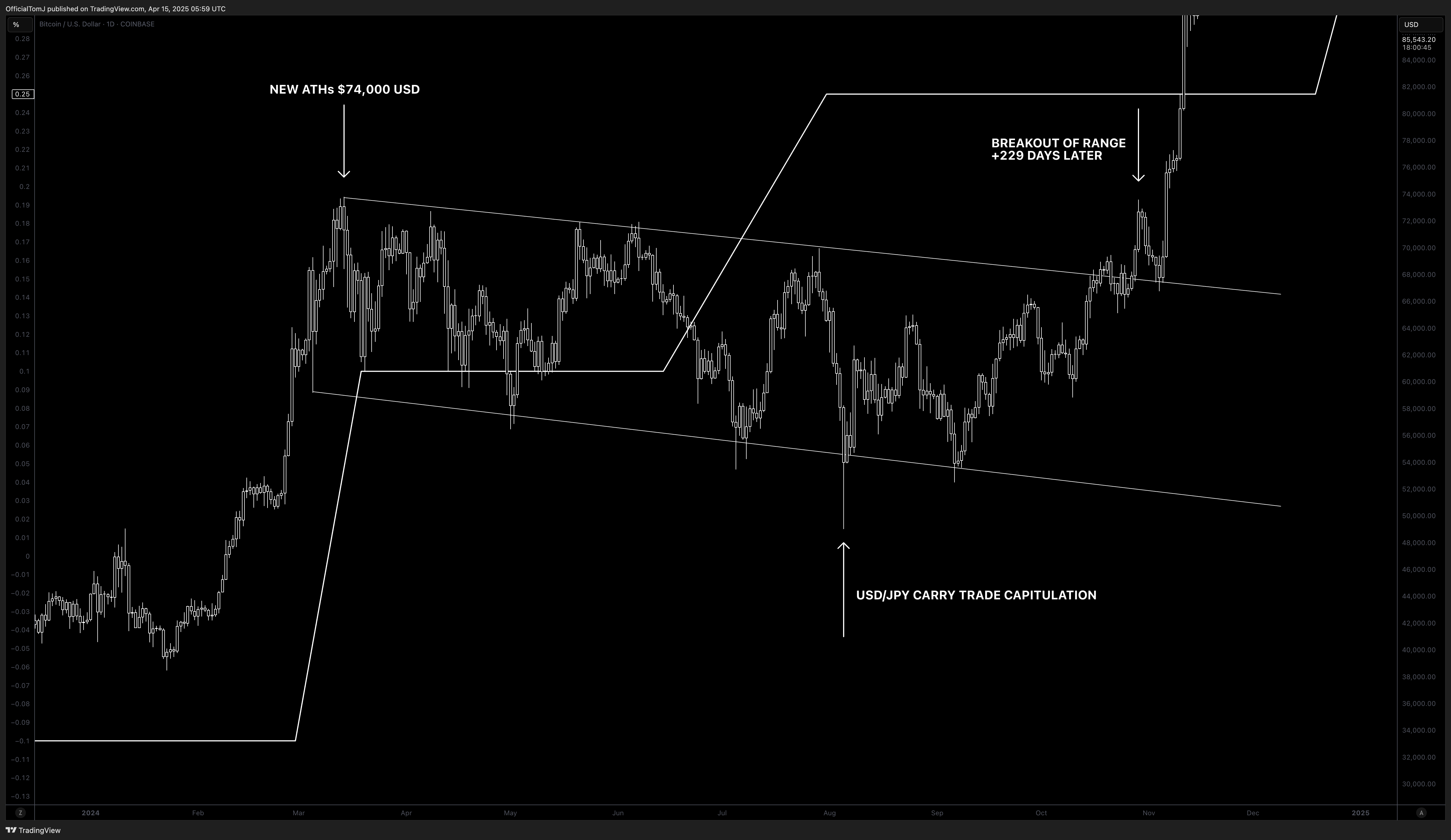 Leading into November 2024, Bitcoin was consolidating in a healthy channel after setting a new all-time high of $74,000. The rally was fuelled by strong ETF inflows and MicroStrategy (now Strategy) continued BTC accumulation, but price action remained relatively contained within a 200-day range. During this period, external macro risks, such as the unwinding of the USD/JPY carry trade due to Bank of Japan interest rate hikes, caused occasional spikes in volatility.