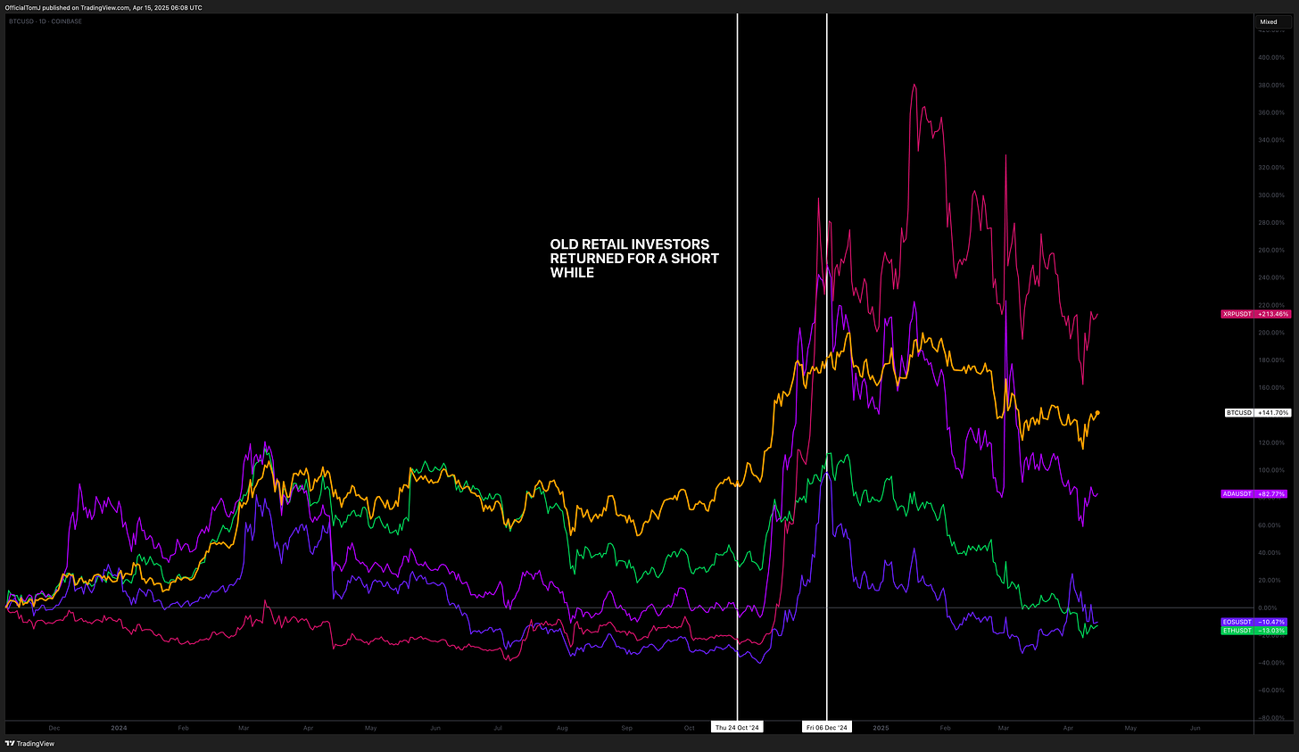 Following the collapse of Trump-related tokens, the memecoin sector saw the most severe losses, with many assets declining by over -90%. However, Bitcoin only experienced a -30% correction, managing to hold above key support levels. This divergence suggests that while speculative excess was flushed from the market, Bitcoin and other fundamentally strong assets remain in a structurally favourable position.