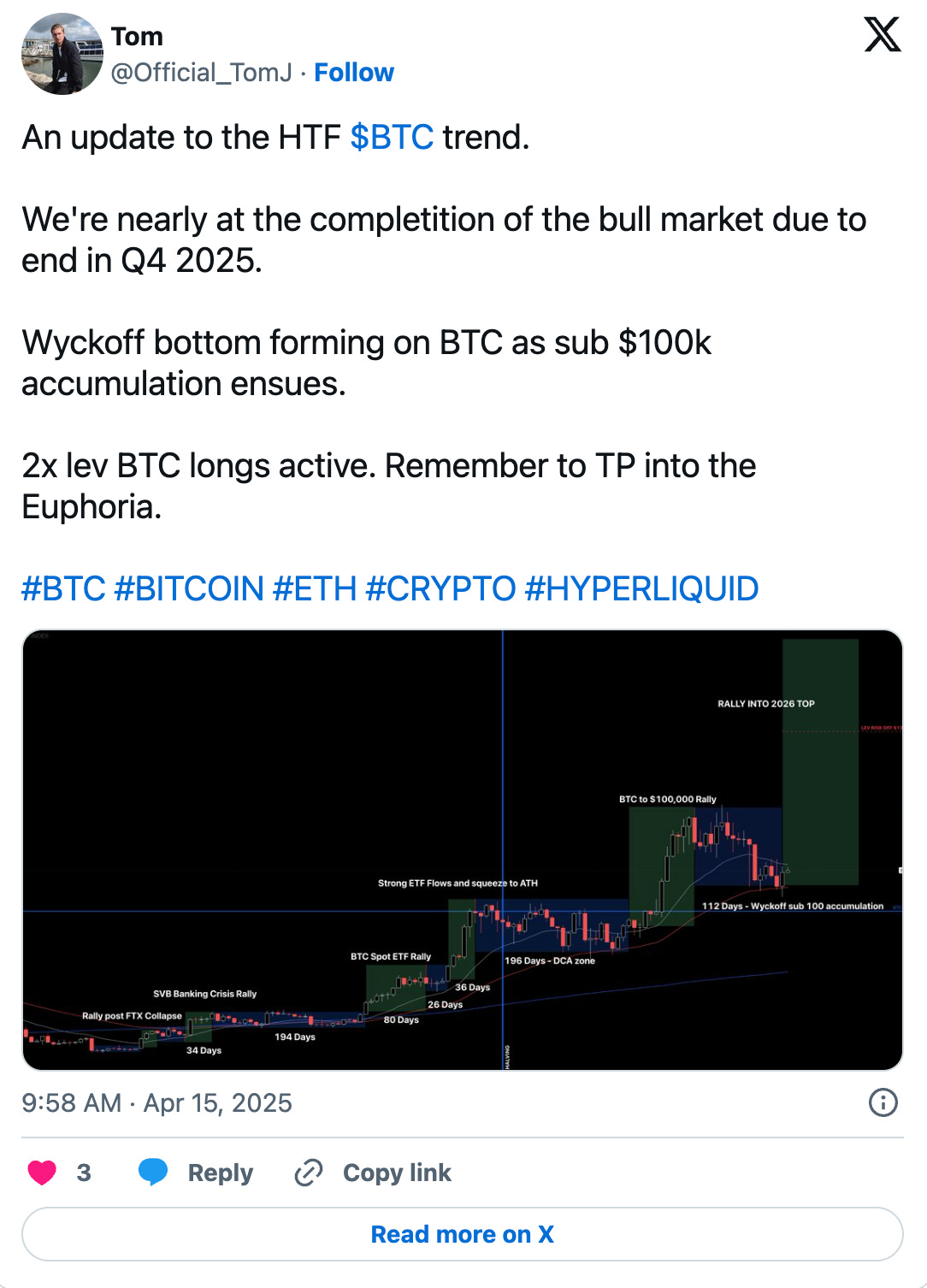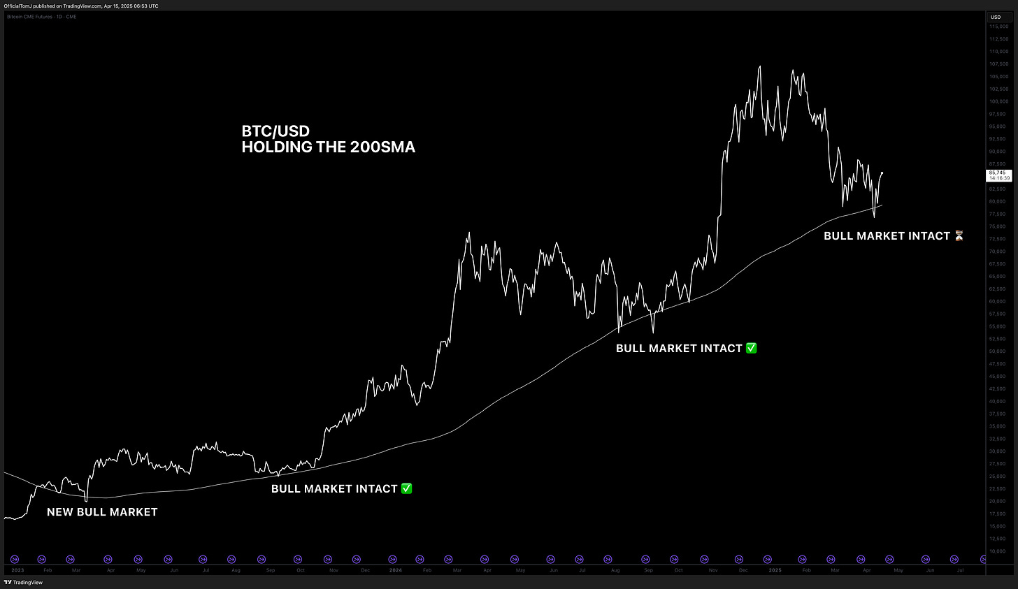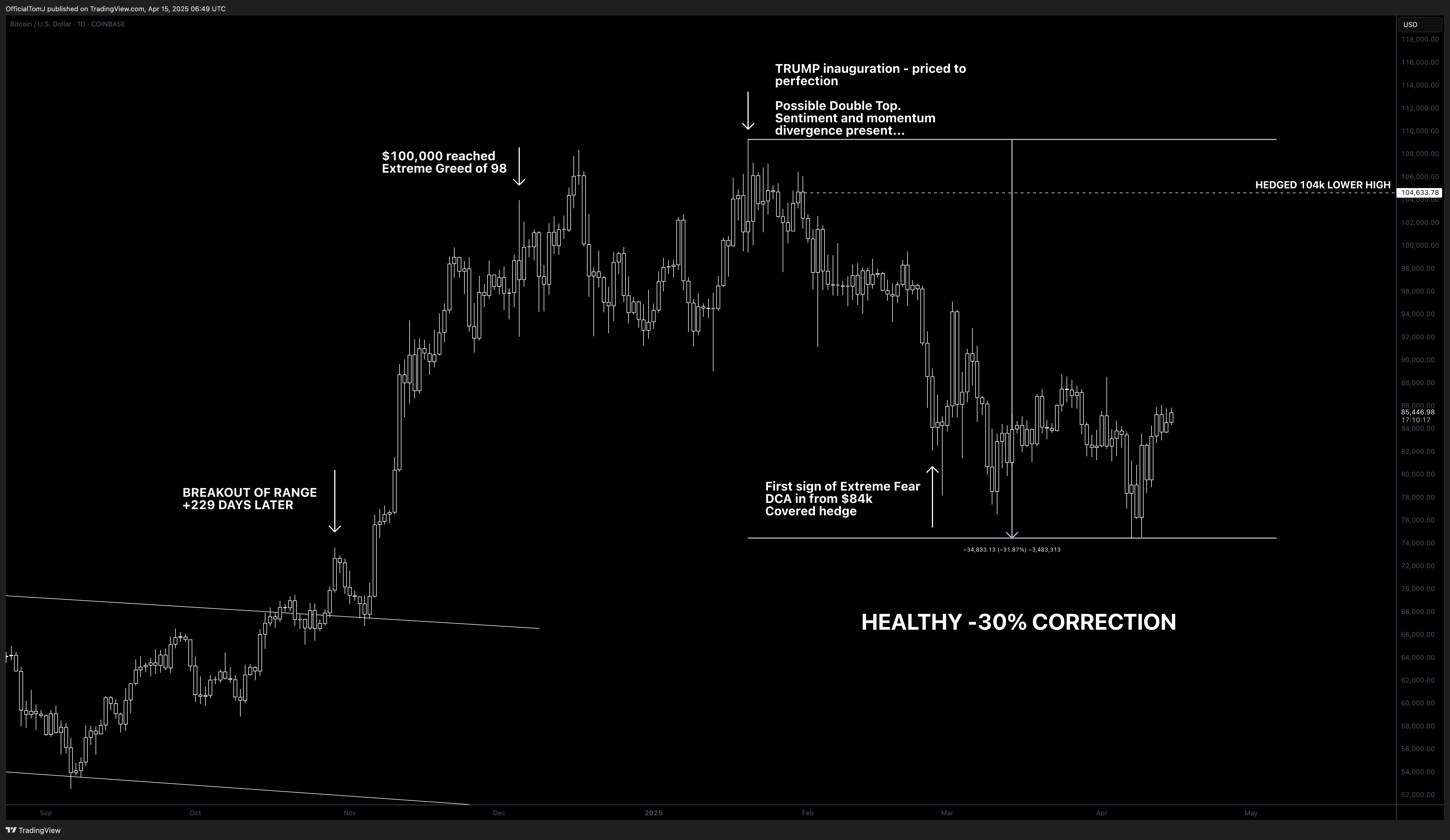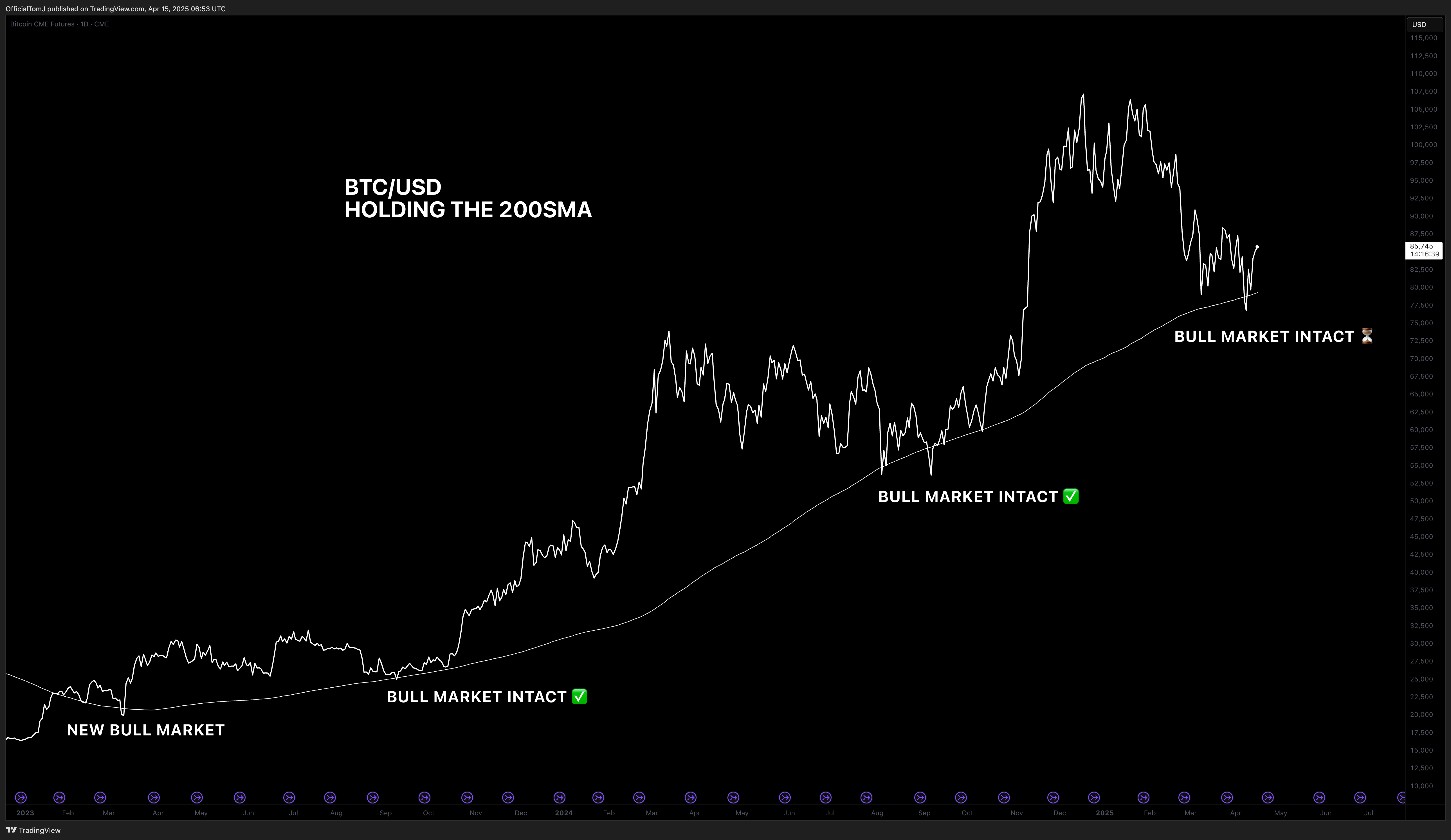 From the $108K high, price dropped sharply, bottoming at $74,200 — right as “Liberation Day” and Trump’s tariff announcements rattled global markets. But despite the noise, BTC has held up remarkably well.