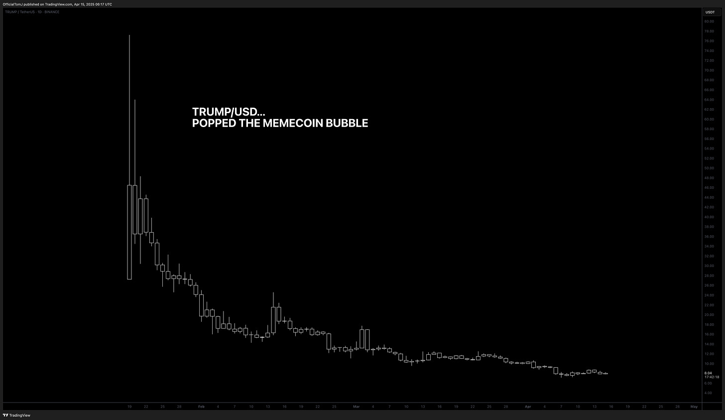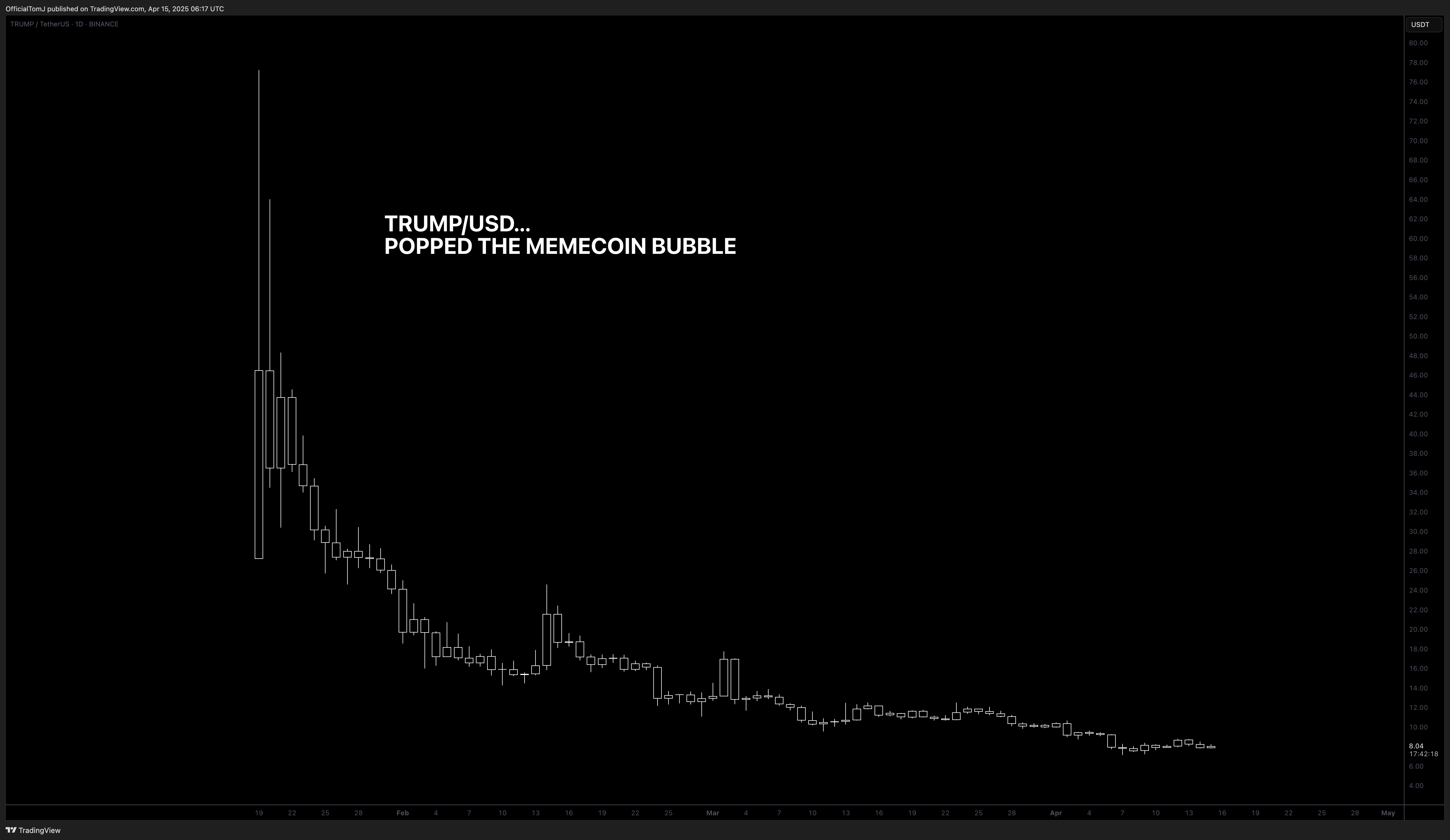 While FARTCOIN and similar speculative assets eventually crashed by over 90%, the real turning point came when Donald Trump’s team launched its own memecoin (TRUMP/USD) on Solana. With 80% of the supply held by Trump-affiliated wallets, the token surged to a $14.5 billion market cap around Trump’s inauguration, only to collapse shortly after. This event triggered contagion across the entire market, leading to a $1.3 trillion total crypto market cap wipeout.